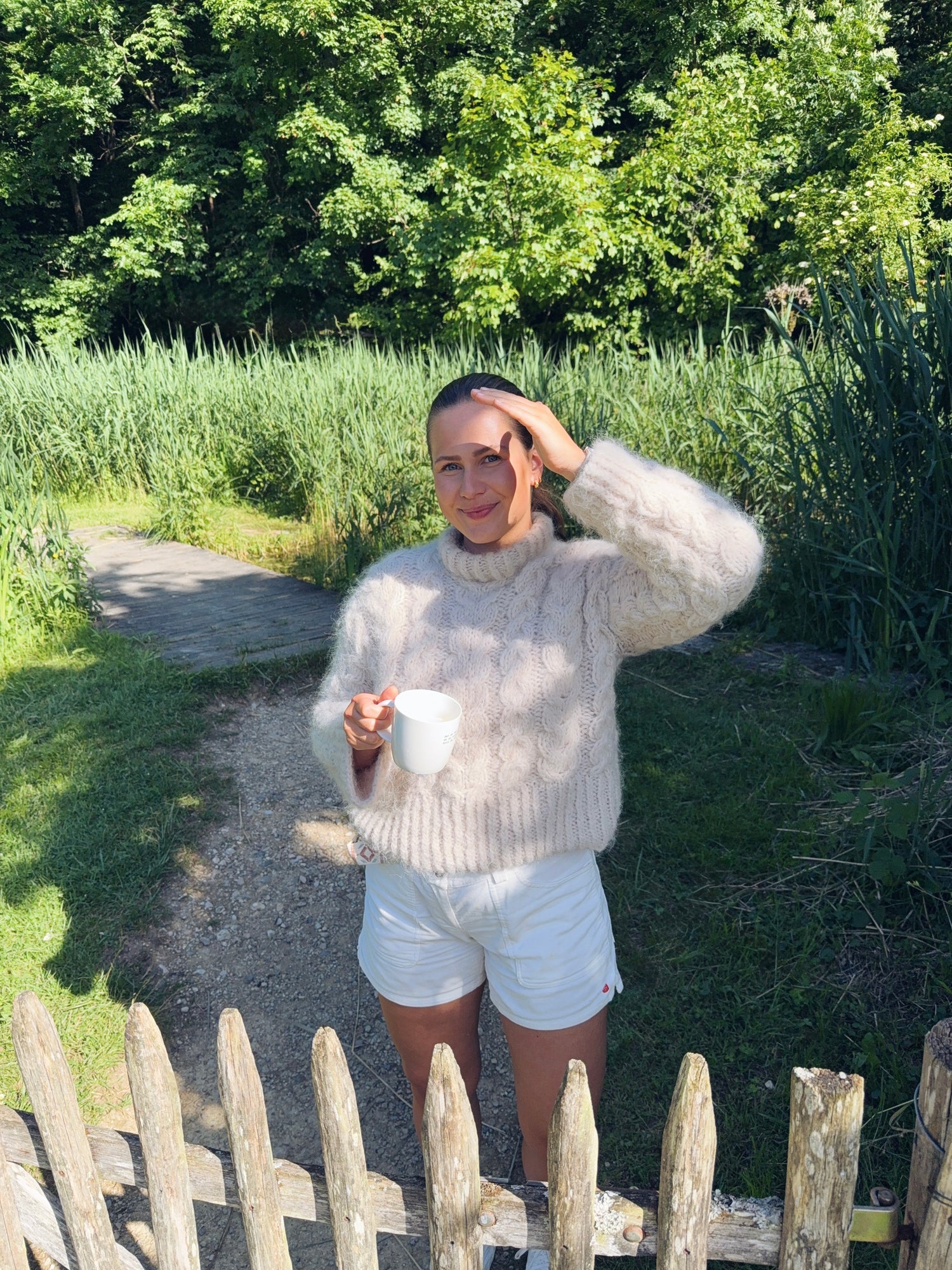 En tykk og myk drøm av en genser, med flettemønster fra topp til tå. Genseren er strikket i en lun blanding av merinoull og børstet alpakka – perfekt til svale sommerkvelder og lange kaffepauser ute.