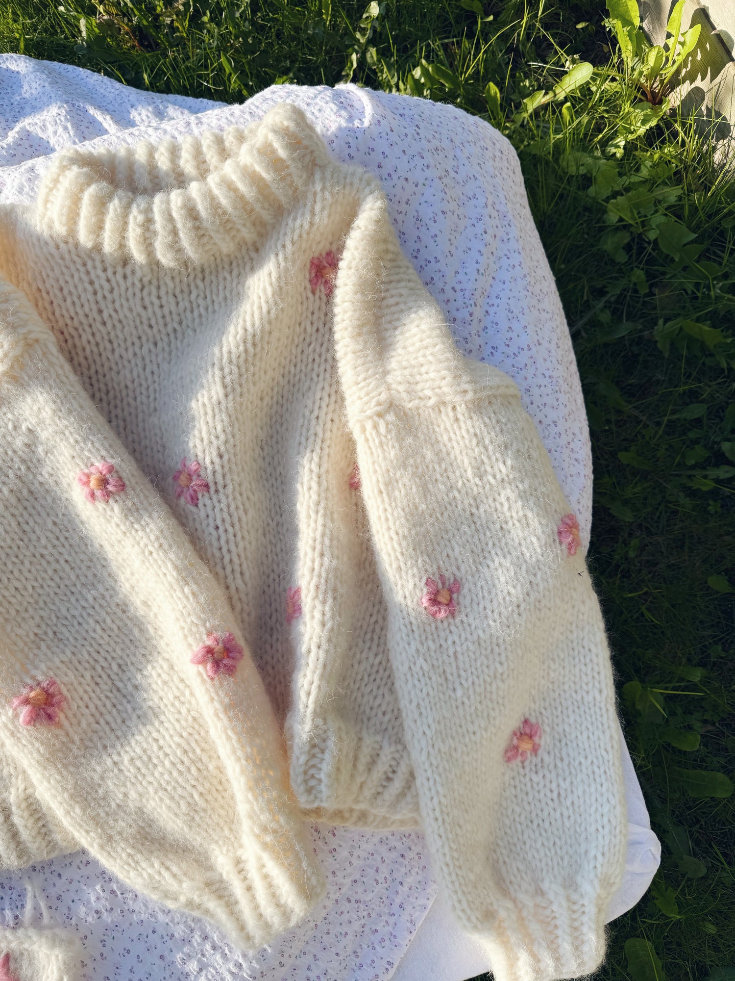En av sommerens søteste gensere? Den er myk, luftig og dekorert med små broderte blomster i nydelige nyanser. Genseren strikkes rundt på rundpinne, nedenfra og opp, og lages i Drops Air – en garnblanding av myk babyalpakka og herlig