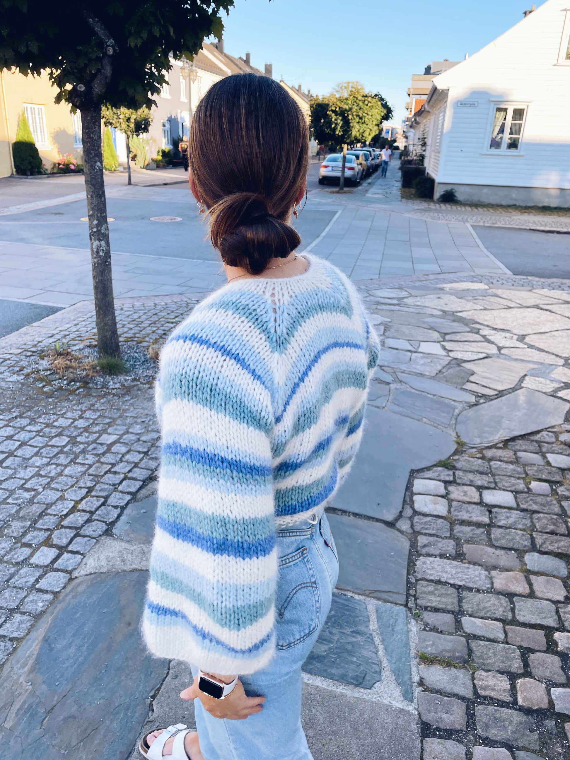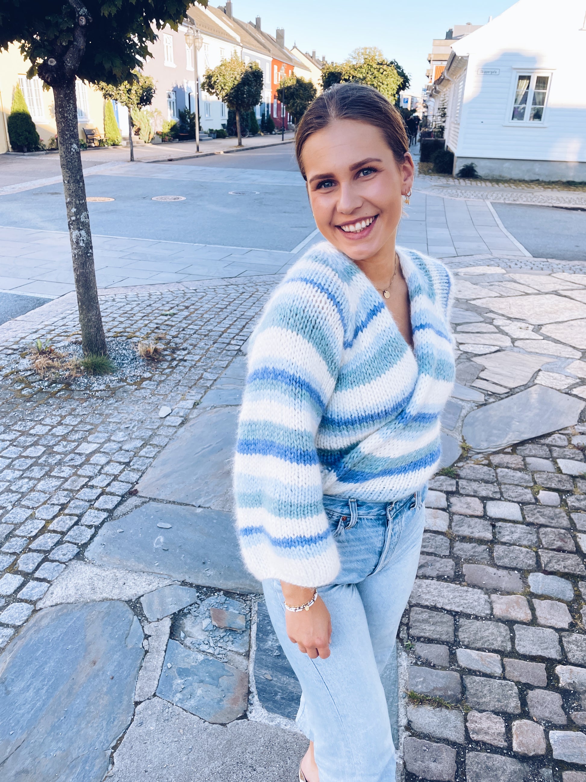 Cardiganen på bildene er strikket i størrelse S.