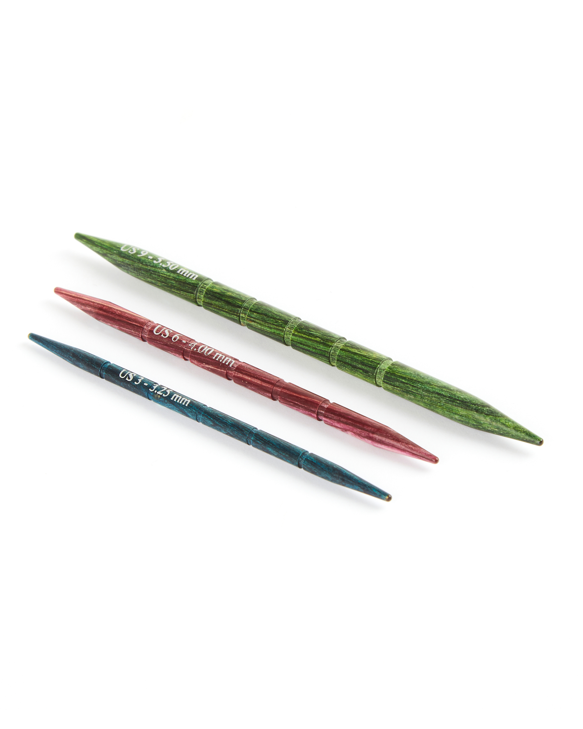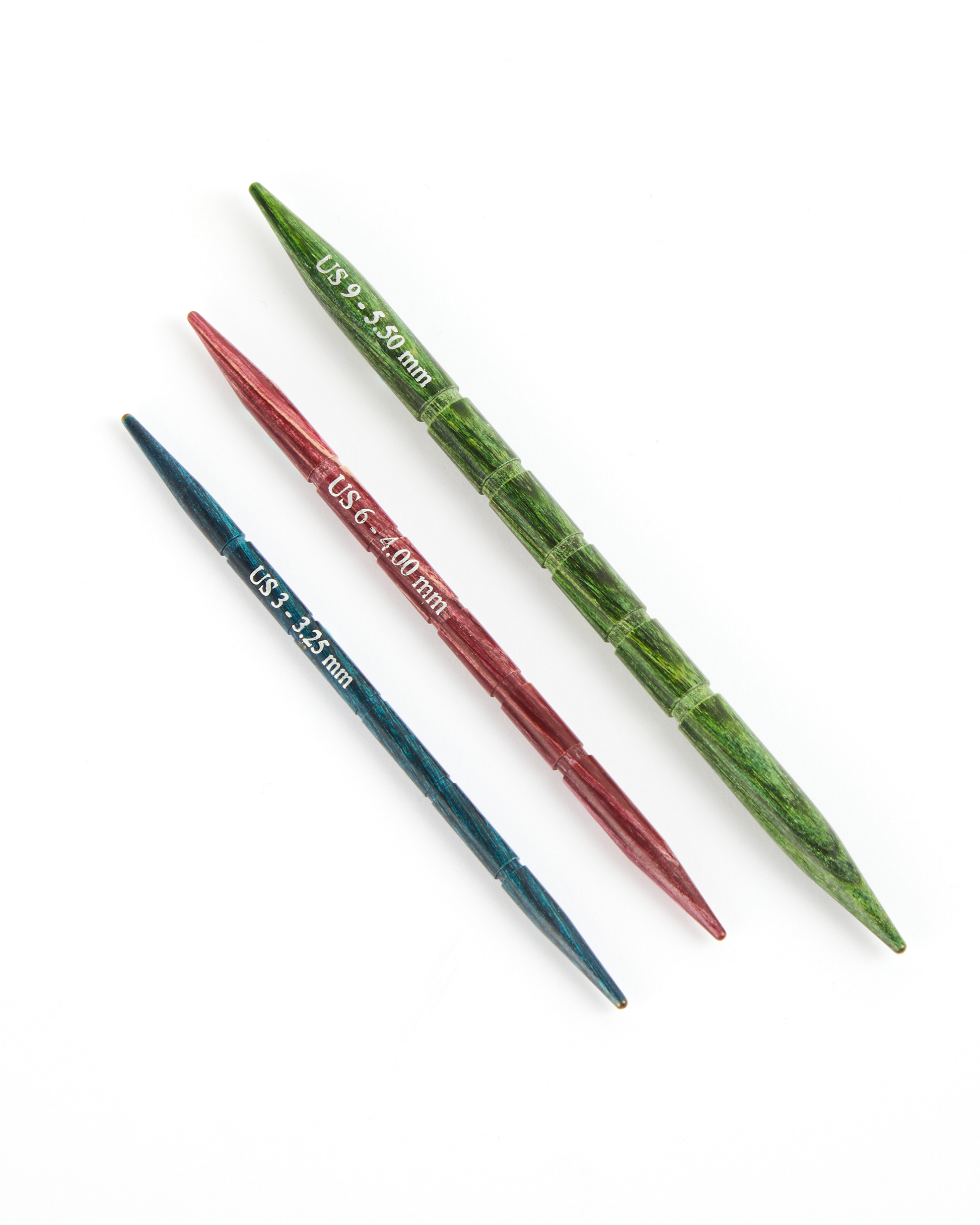 Settet inneholder tre flettepinner i størrelsene 3.25 mm, 4 mm og 5.5 mm.