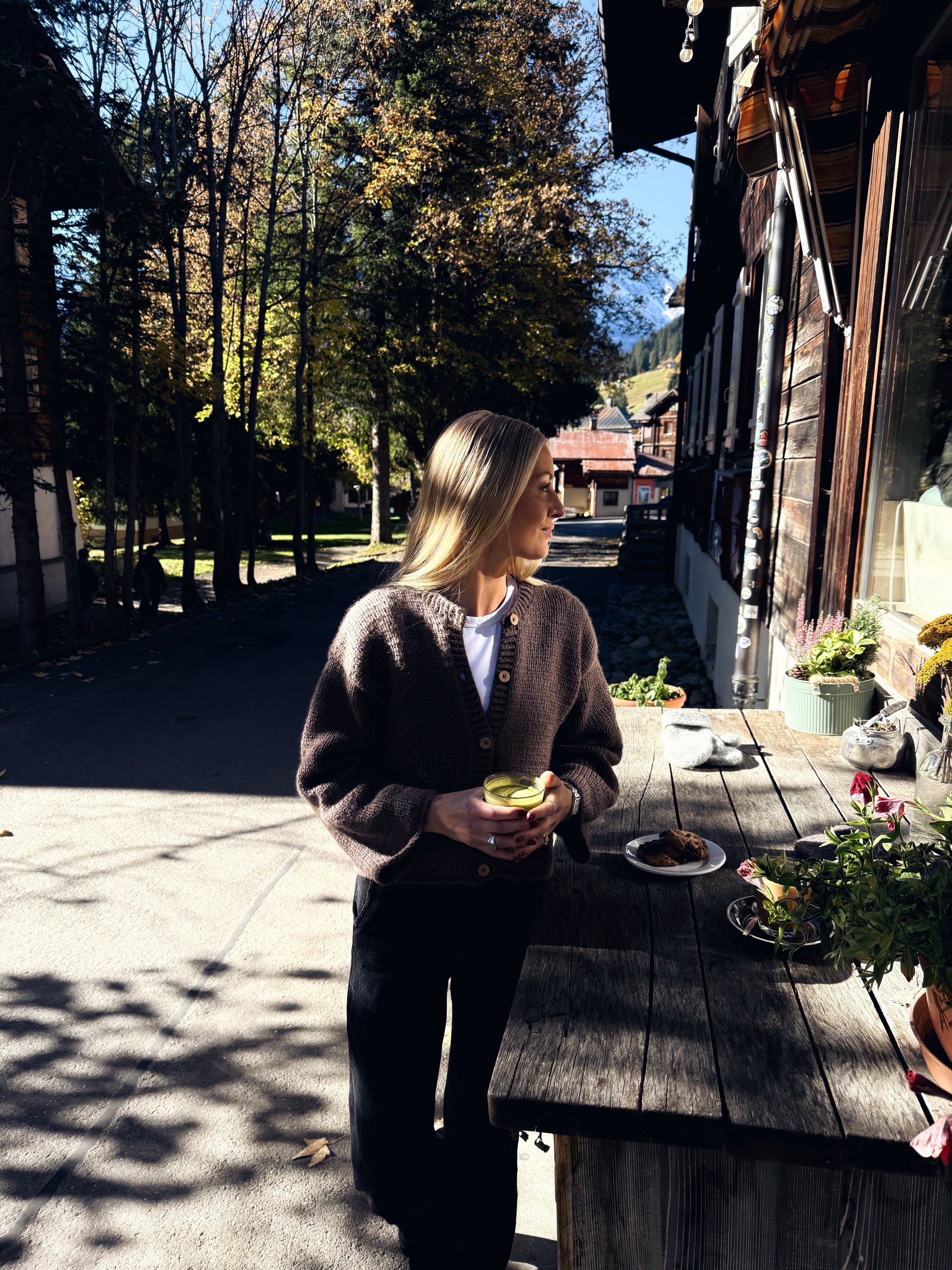 Elara er en lun og tidløs cardigan, strikket i en luksusblanding av merinoull og kamelhår, som varmer og føles myk mot huden. Det klassiske designet gir et rolig uttrykk og en følelse av komfort gjennom kalde vinterdager.
