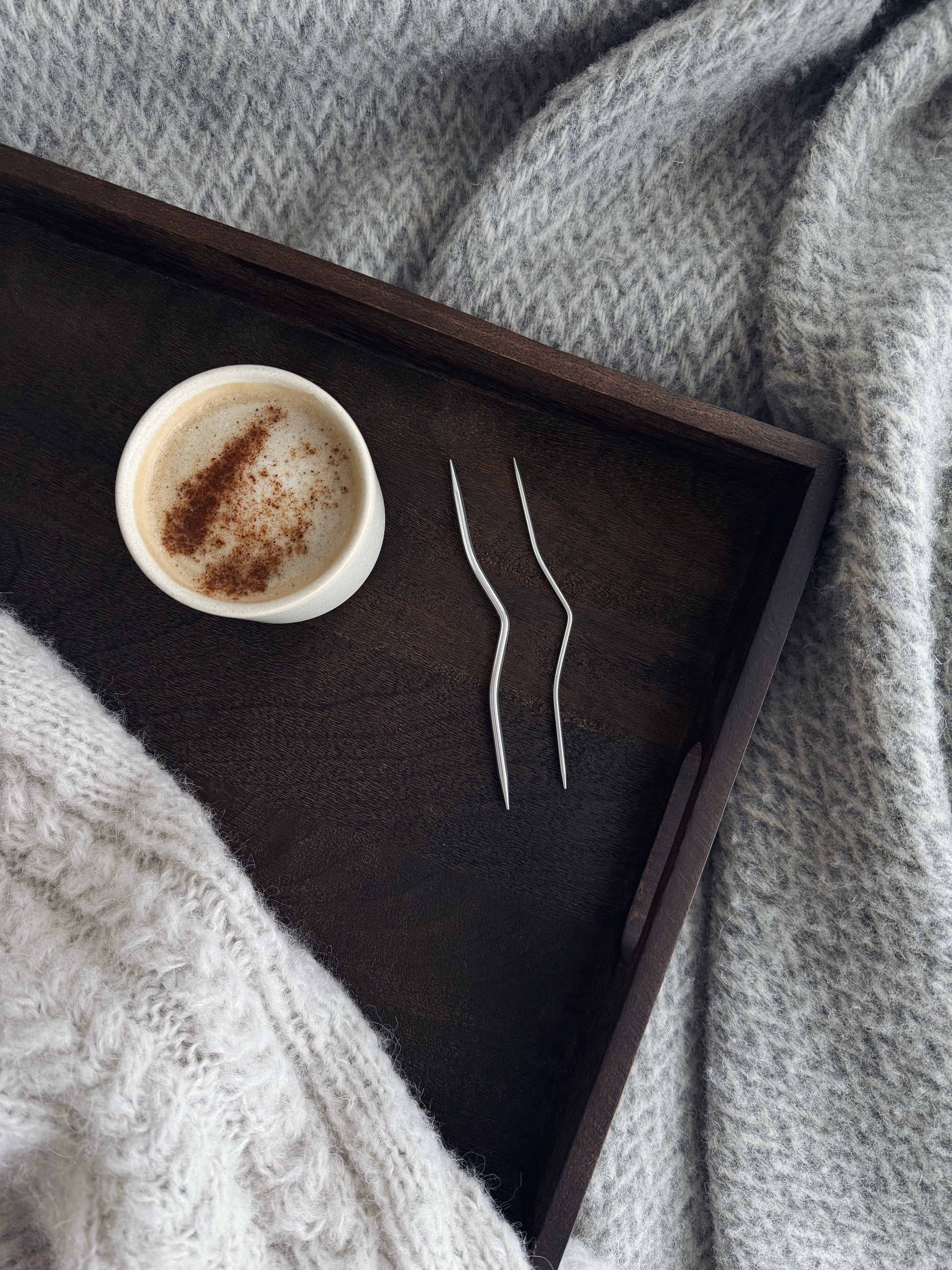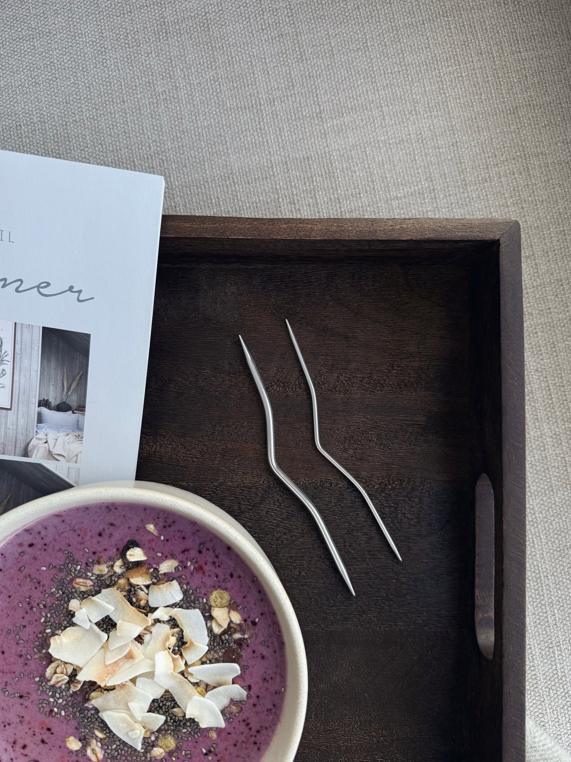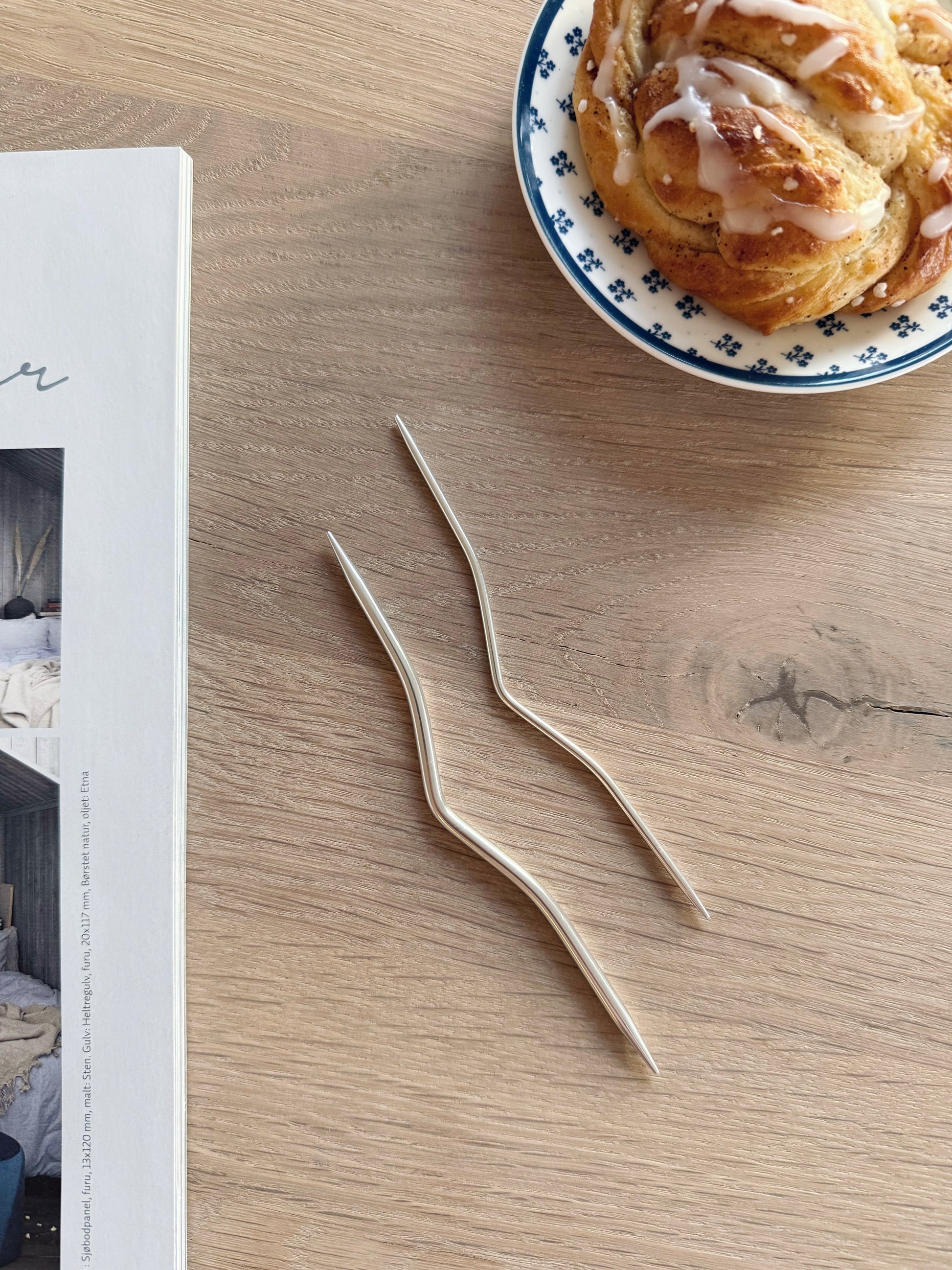 Med disse flettepinnene blir flettestrikk både enkelt og presist. Pinnene har en myk vinkel i midten som holder maskene trygt på plass til de skal strikkes. Pakken inneholder to størrelser - én til tynnere garn og én til litt tykkere prosjekter.