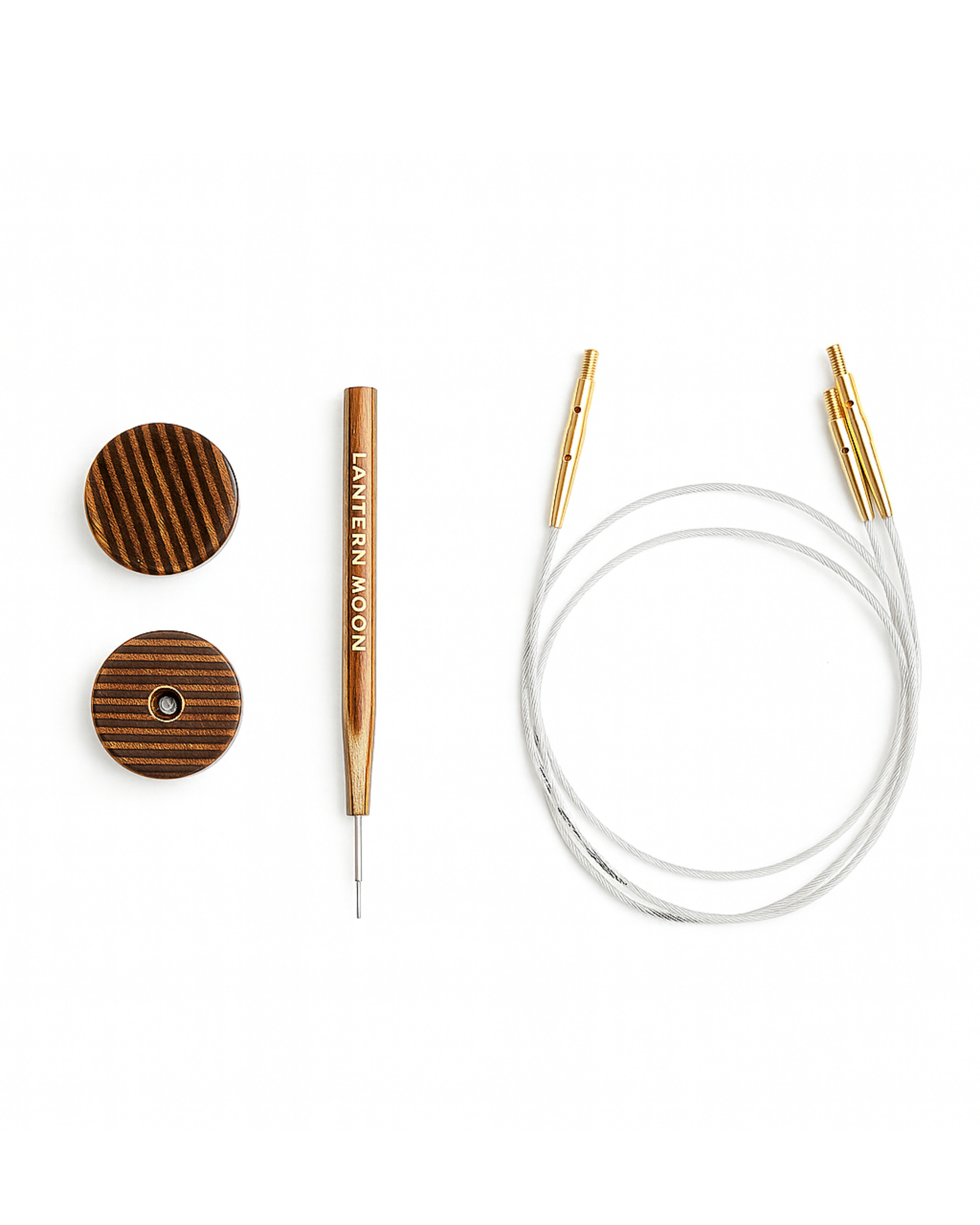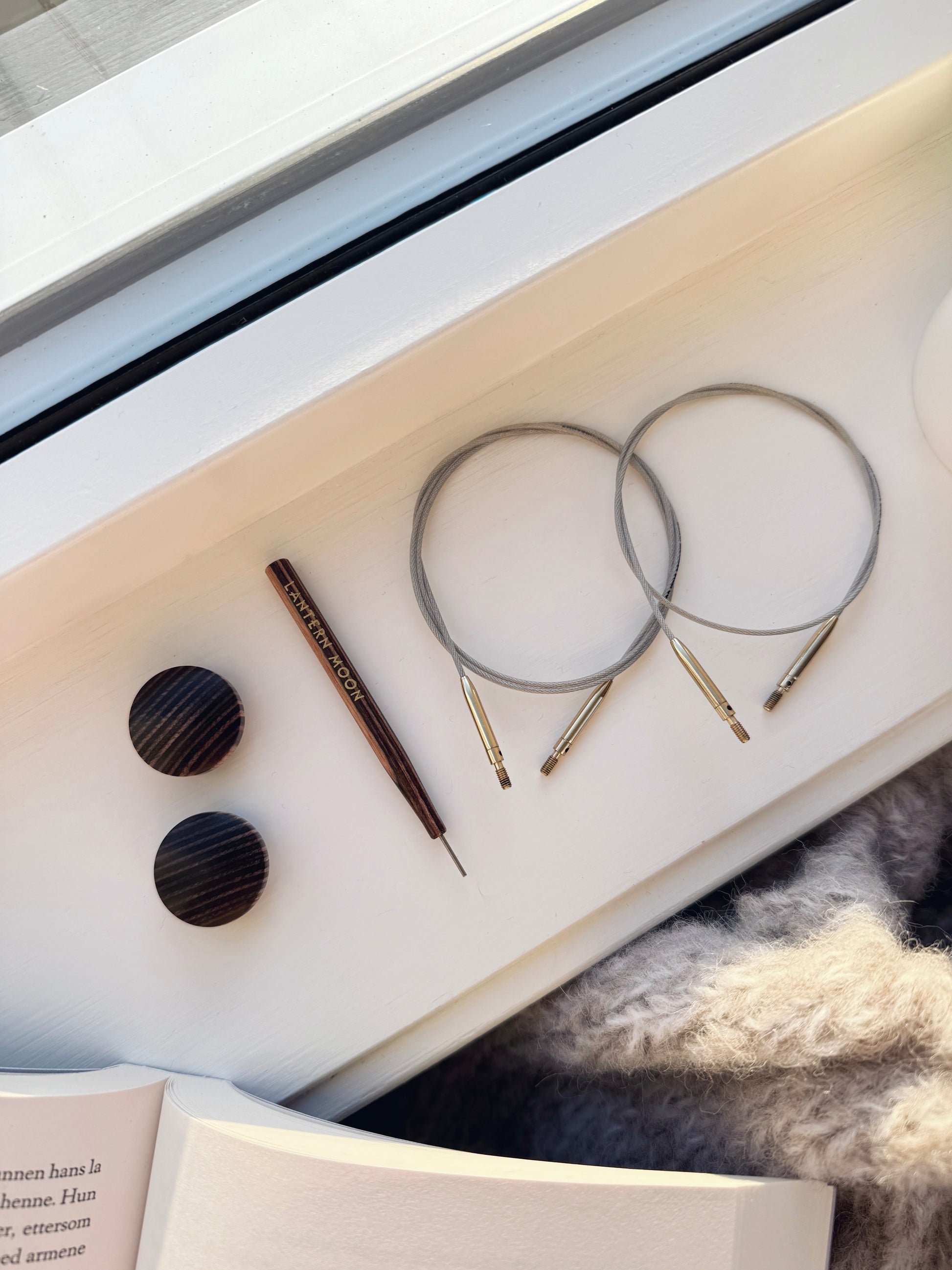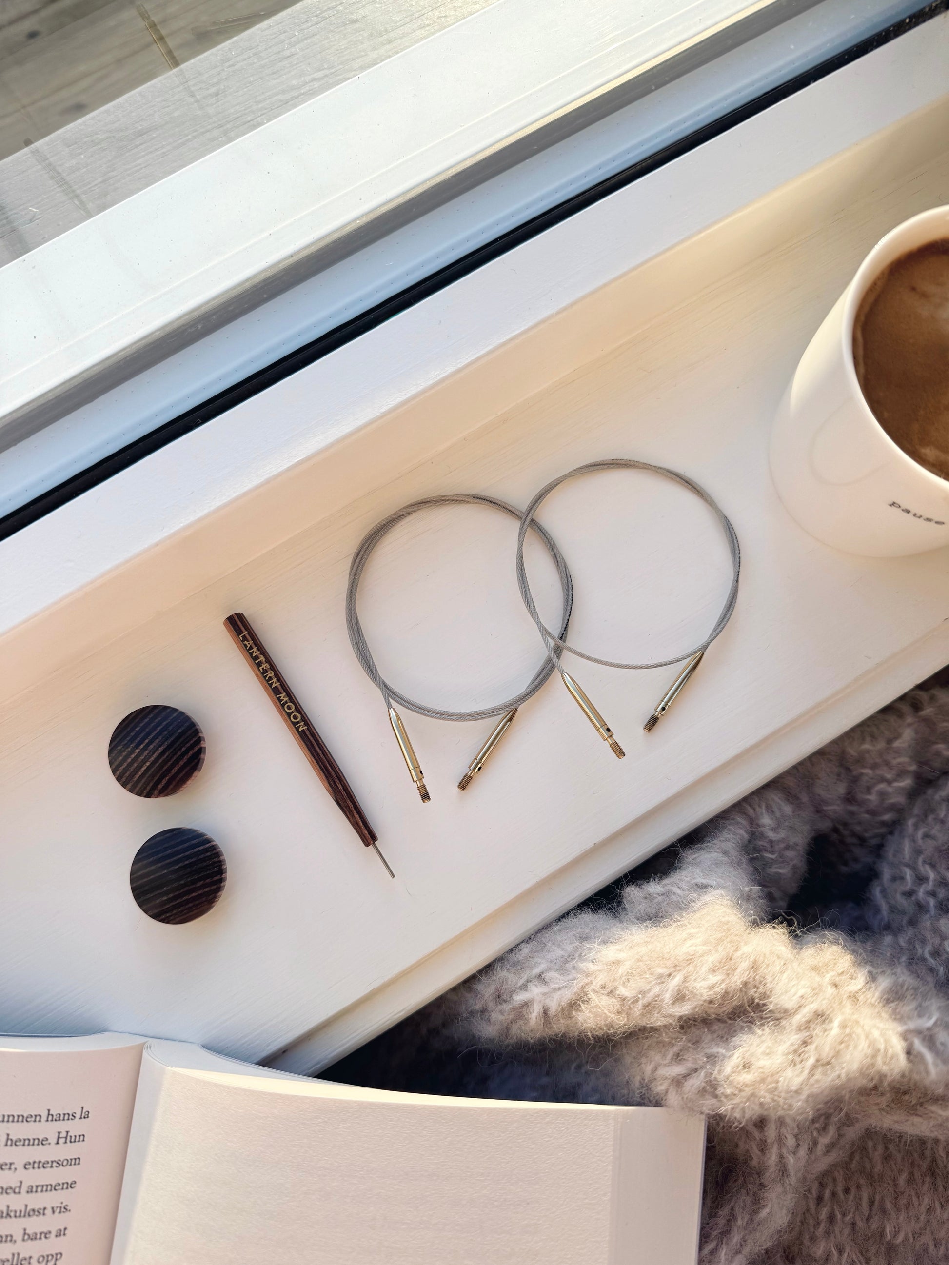 Vaier i nylonbelagt rustfritt stål med roterende messingfester, til Lantern Moon utskiftbare pinner. Den roterende mekanismen gir en jevn og fleksibel strikkeopplevelse.