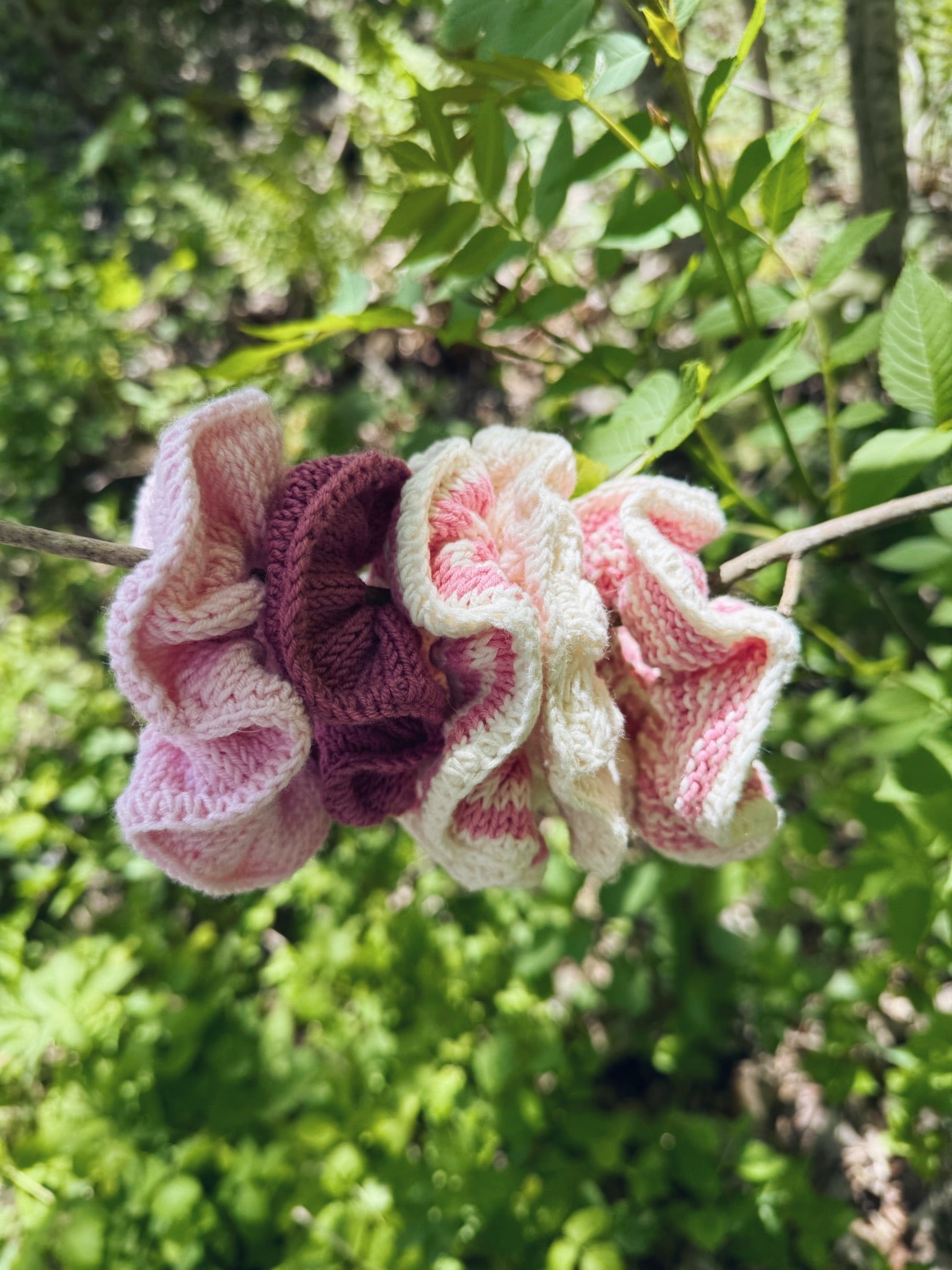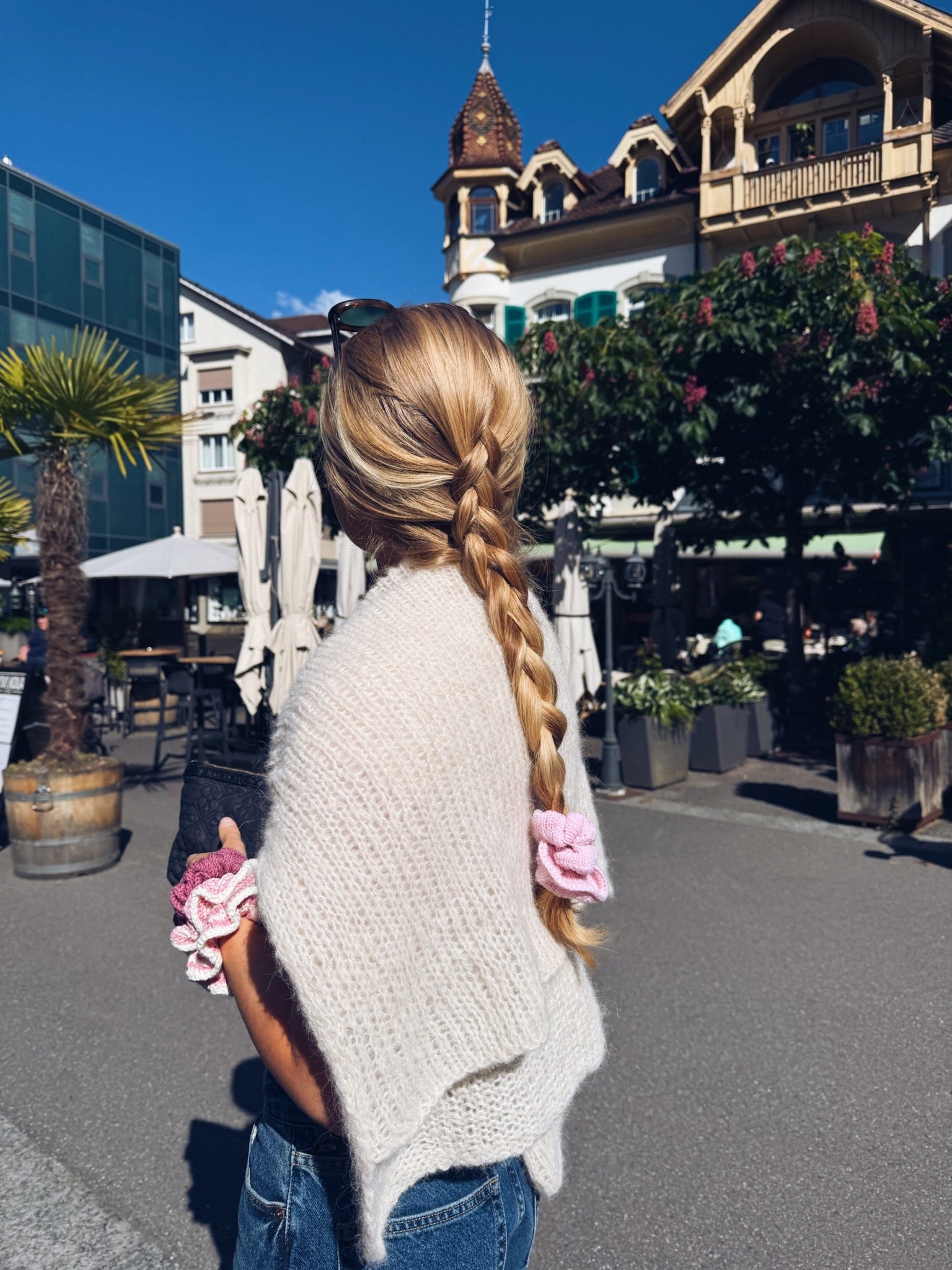 Gjør looken komplett med scrunchies i tre ulike design: Lilly er strikket i ensfarget rettstrikk, Ivy i vakkert flettemønster og Fanny i søte striper hvor du kan velge både vrangsiden og rettsiden som utside.