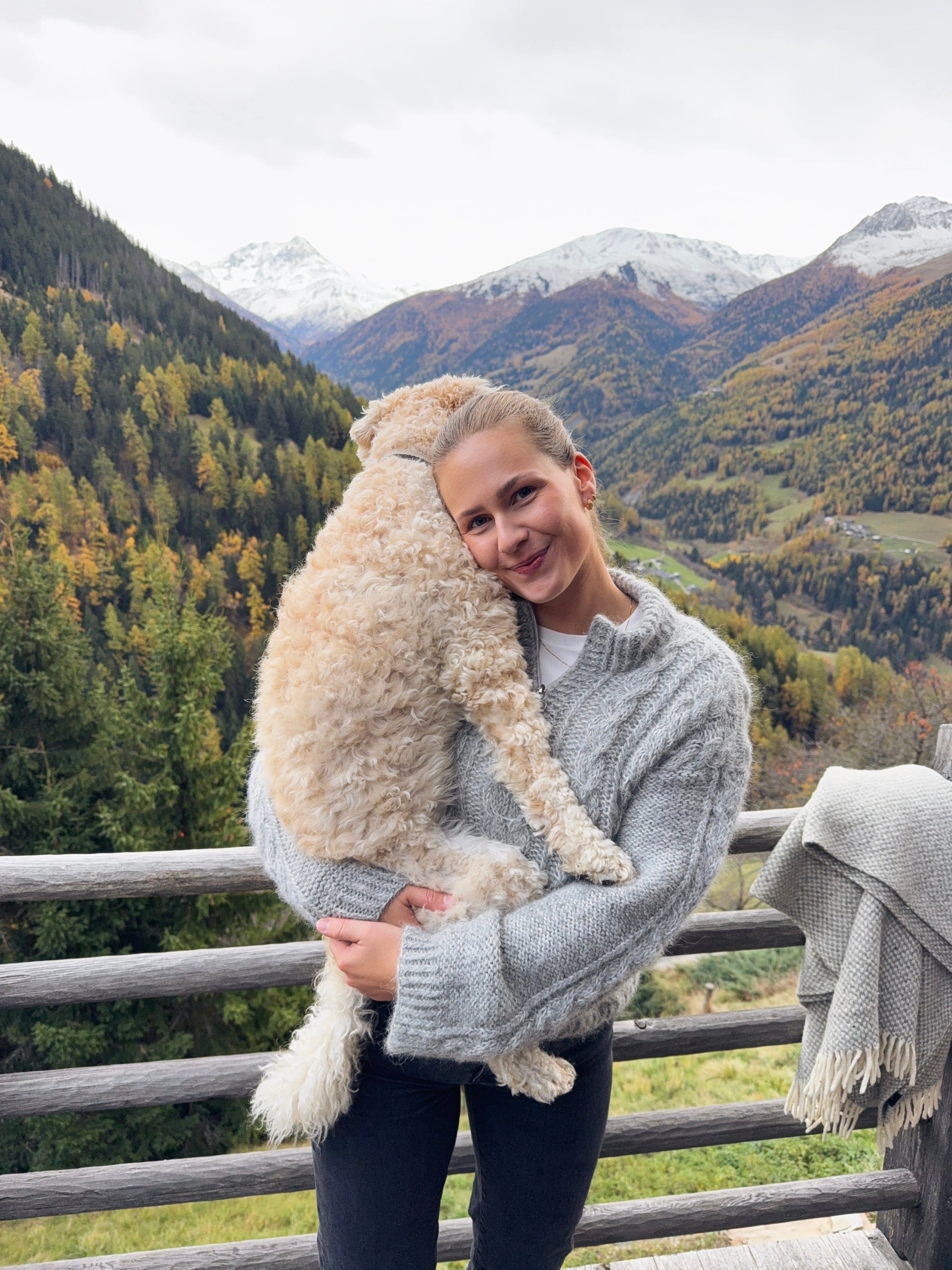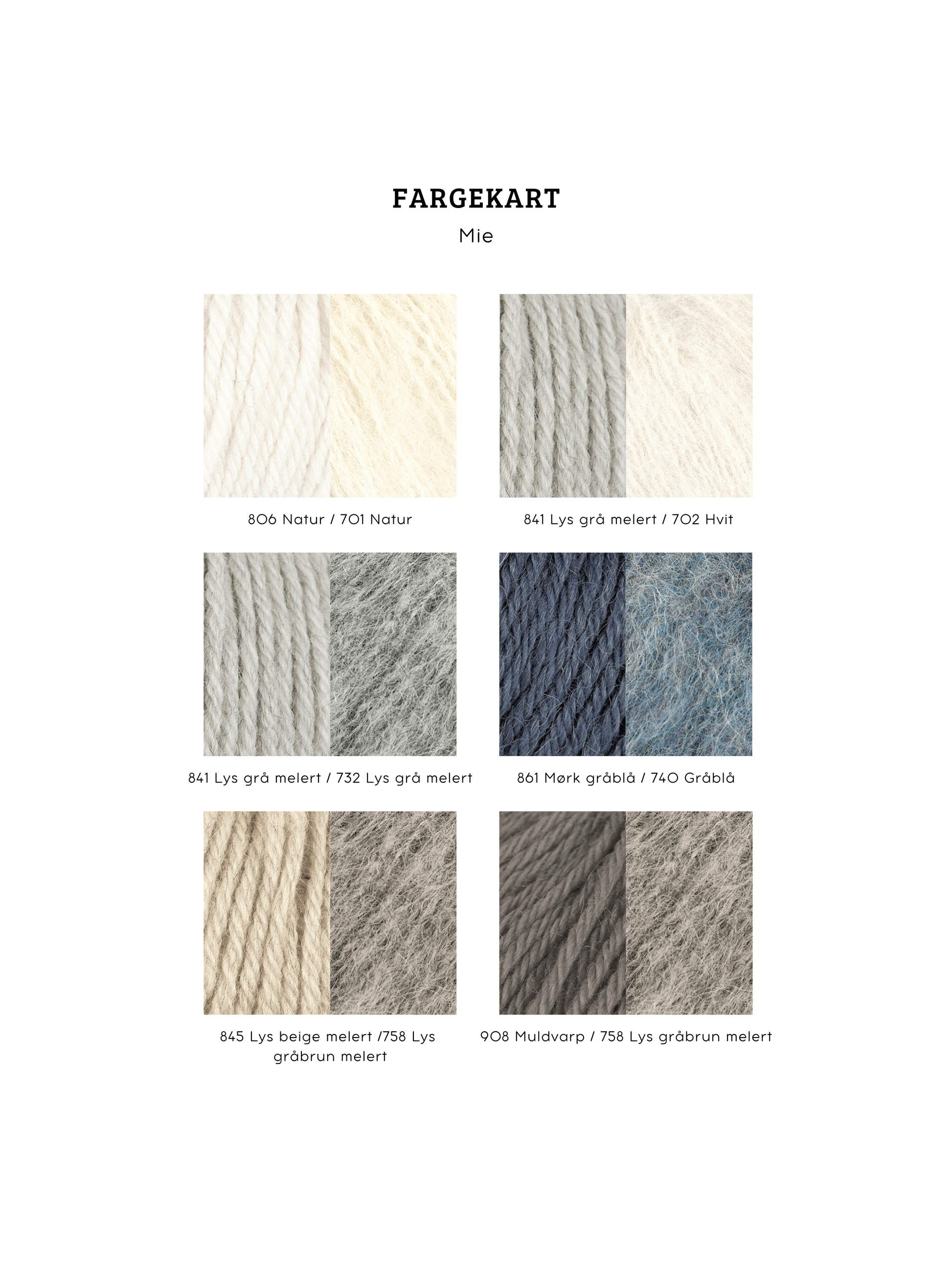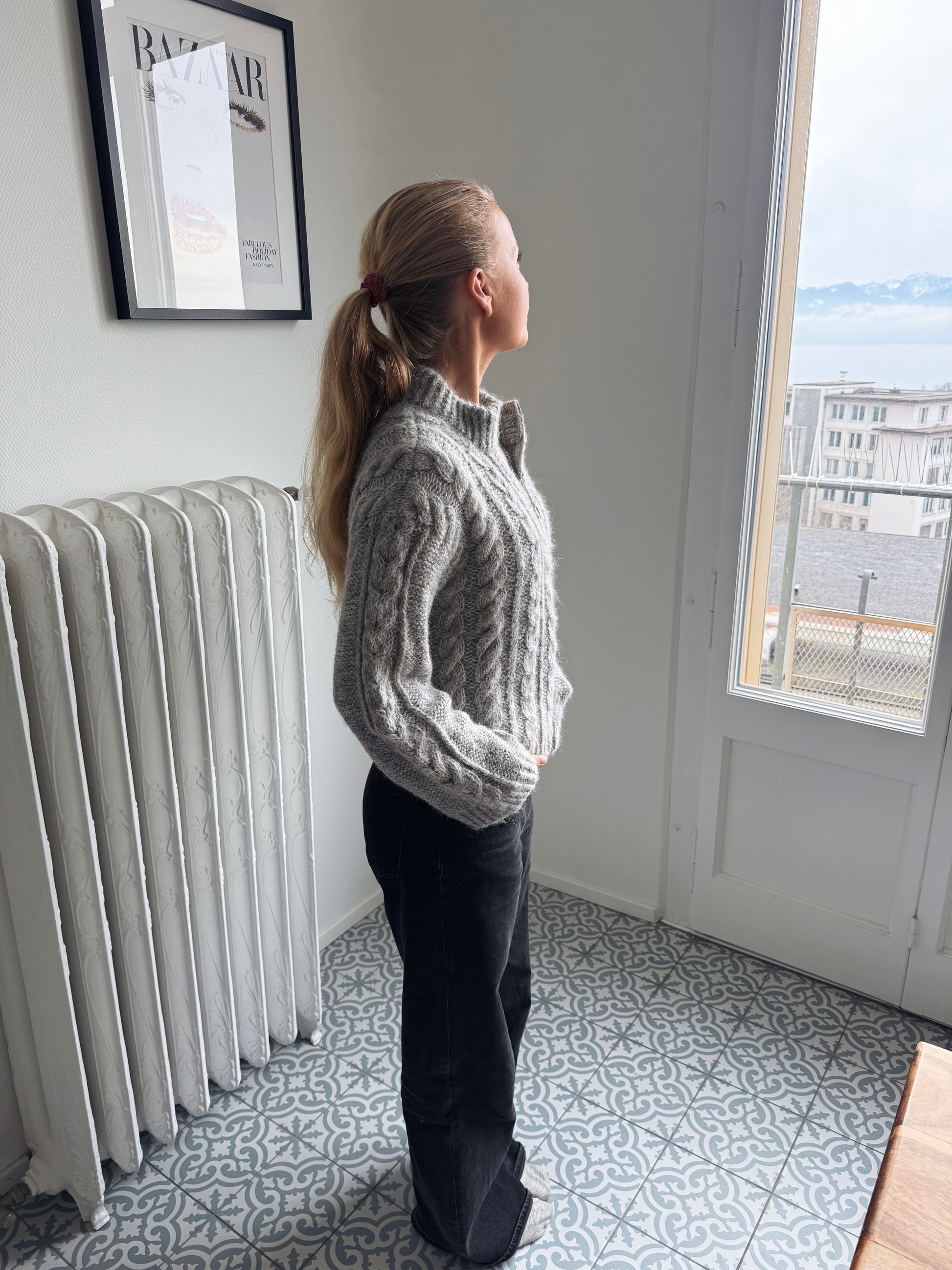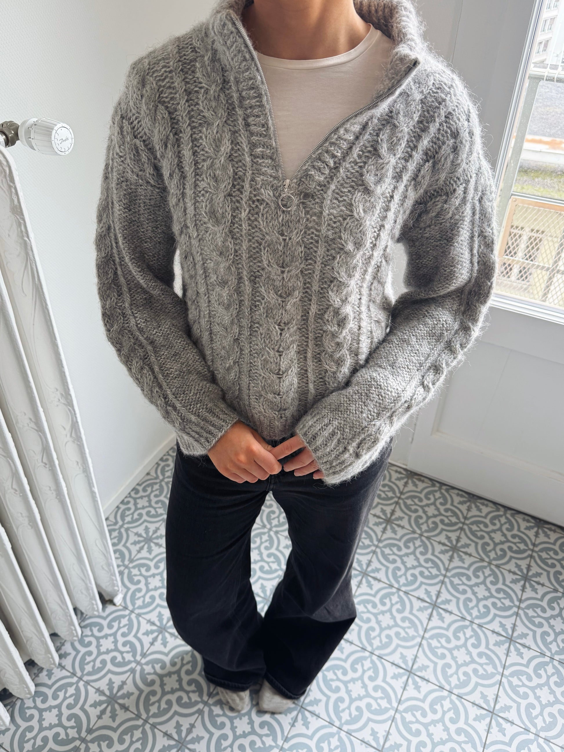 Mie er en lett og myk zip-genser med vide ermer og et vakkert flettemønster som preger hele plagget. Den er strikket i en blanding av alpakka og merinoull, og kombinerer varme med en luftig og behagelig følelse.