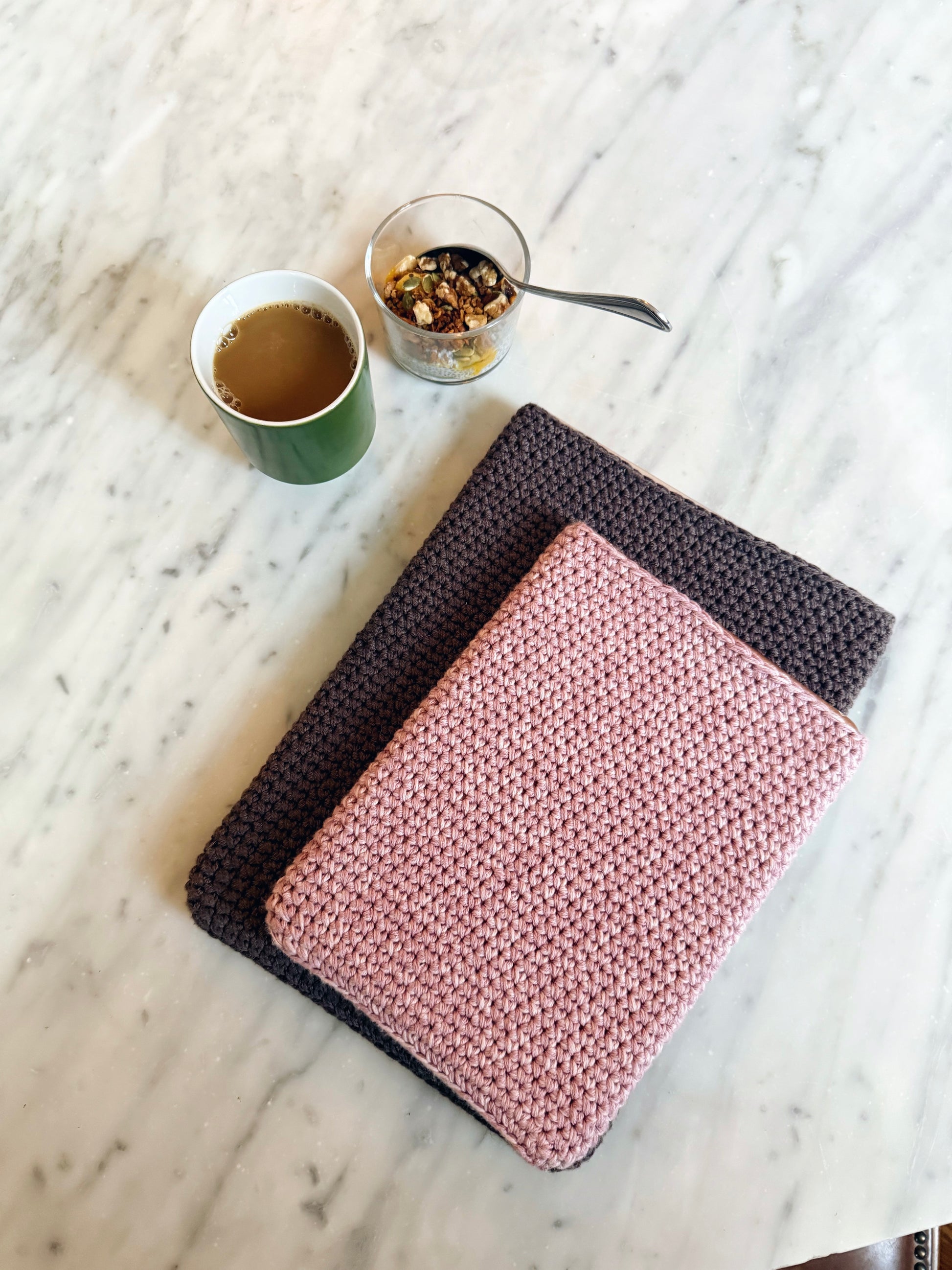 Mappene på bildene er heklet i fargene 8171 Muldvarp og 8123 Gammelrosa/8121 Dus Rosa.