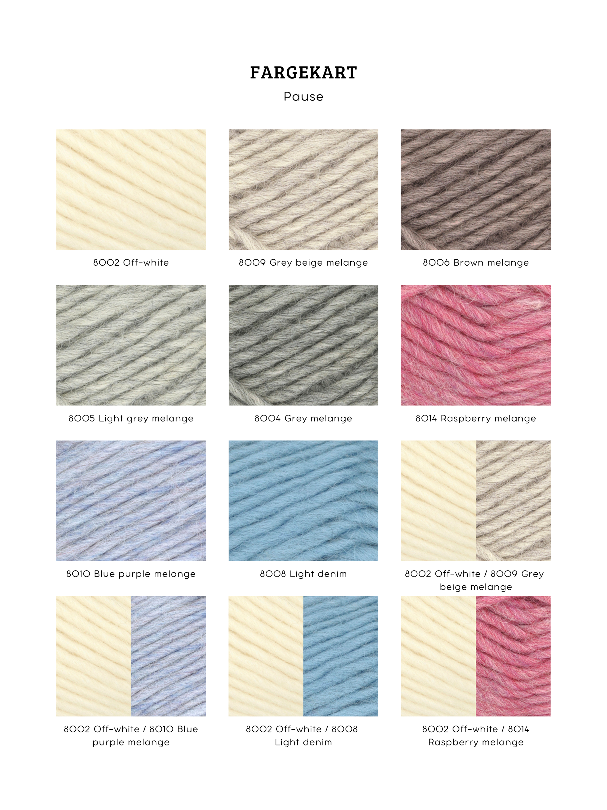 Sitteunderlagene på bildene er strikket i fargene 8002 Off-white / 8014 Raspberry melange og 8002 Off-white / 8010 Blue purple melange.