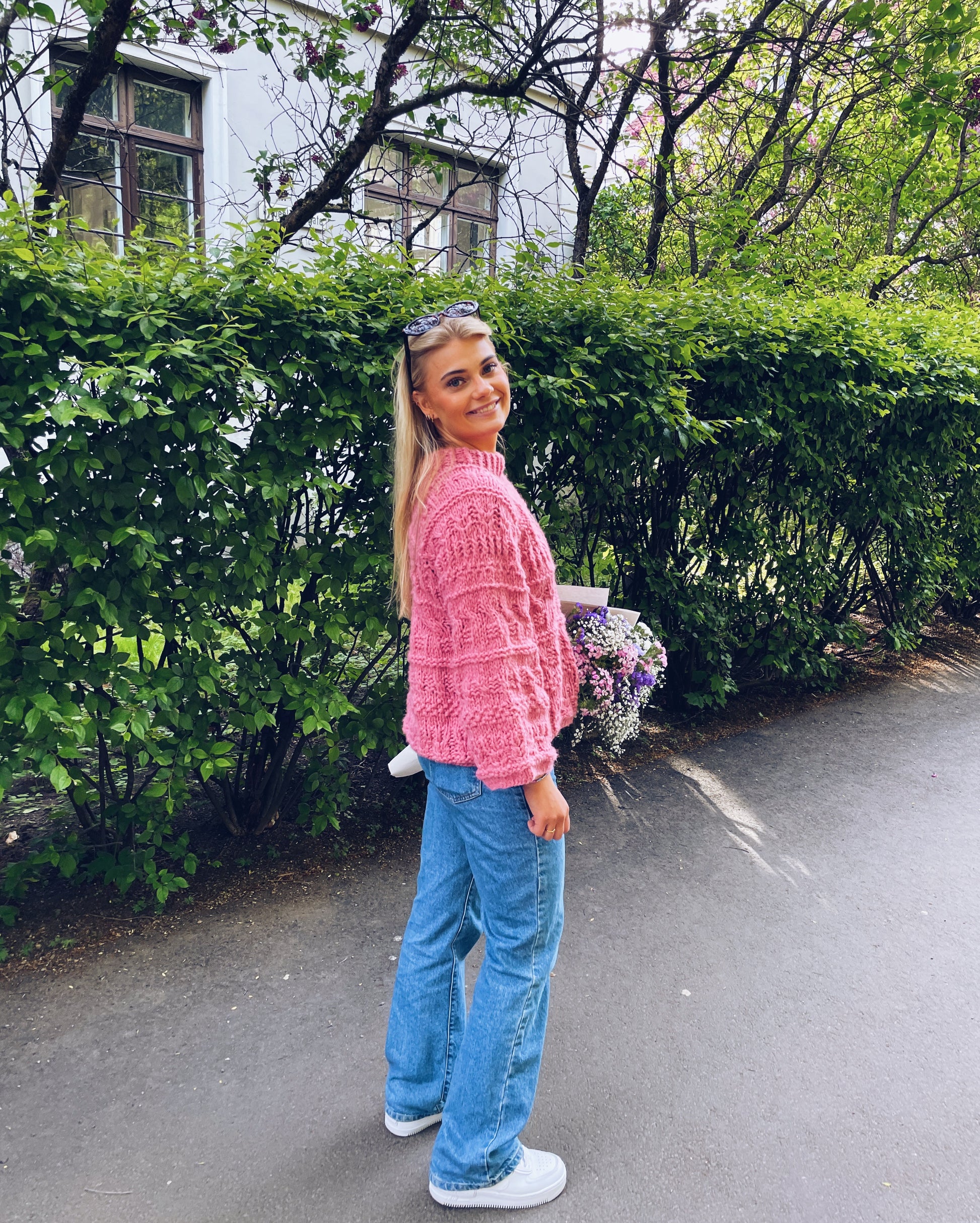 350 (400) 450 (450) (500) gram Deilig fra Knit Norway. Genseren på bildene er strikket i fargen col. 316 pale pink.