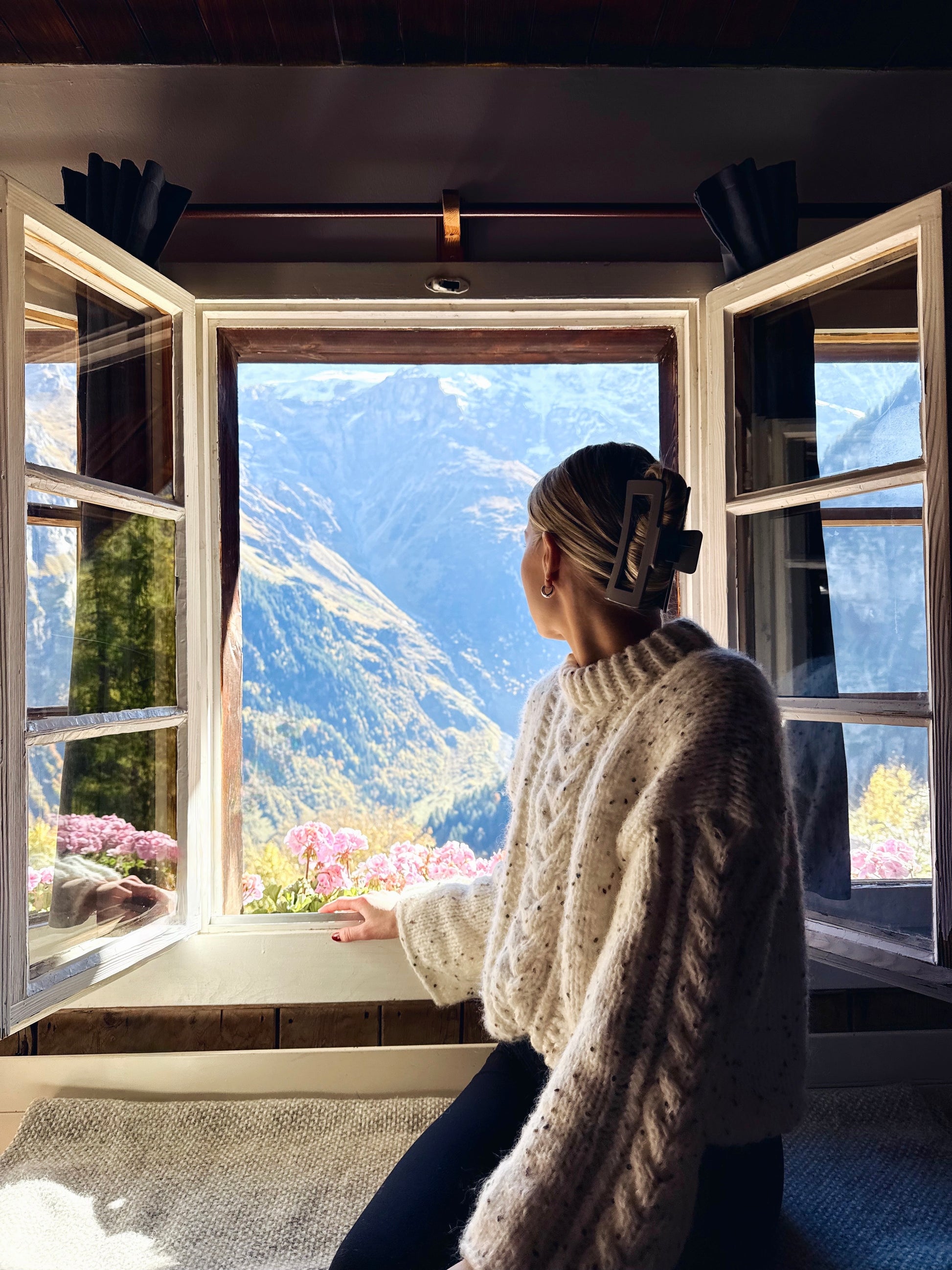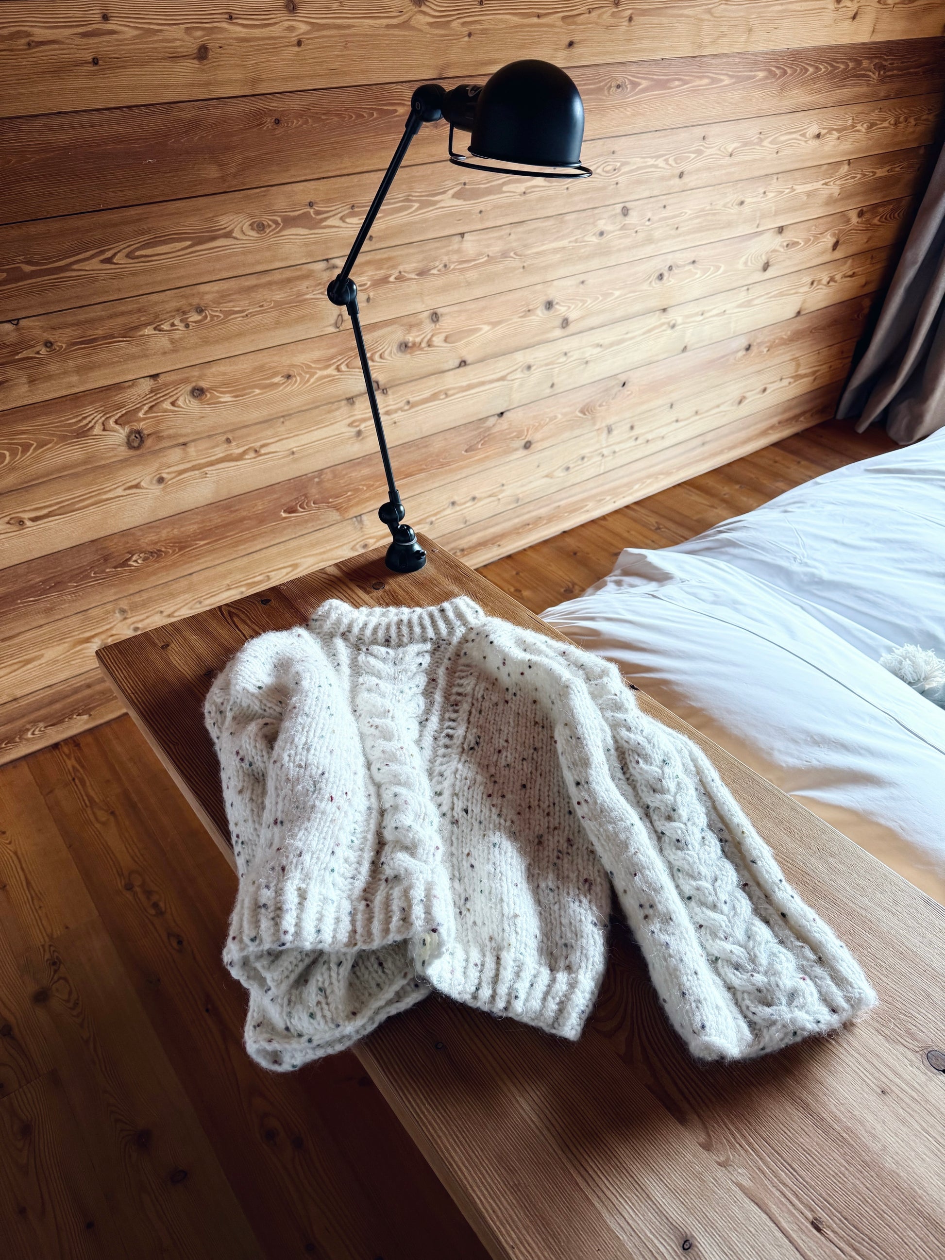 Stjernefall er en lun og lett genser i alpakka og effektgarn, med myke fletter og små fargerike knupper. Et plagg som kombinerer varme med et rolig uttrykk og fine detaljer.