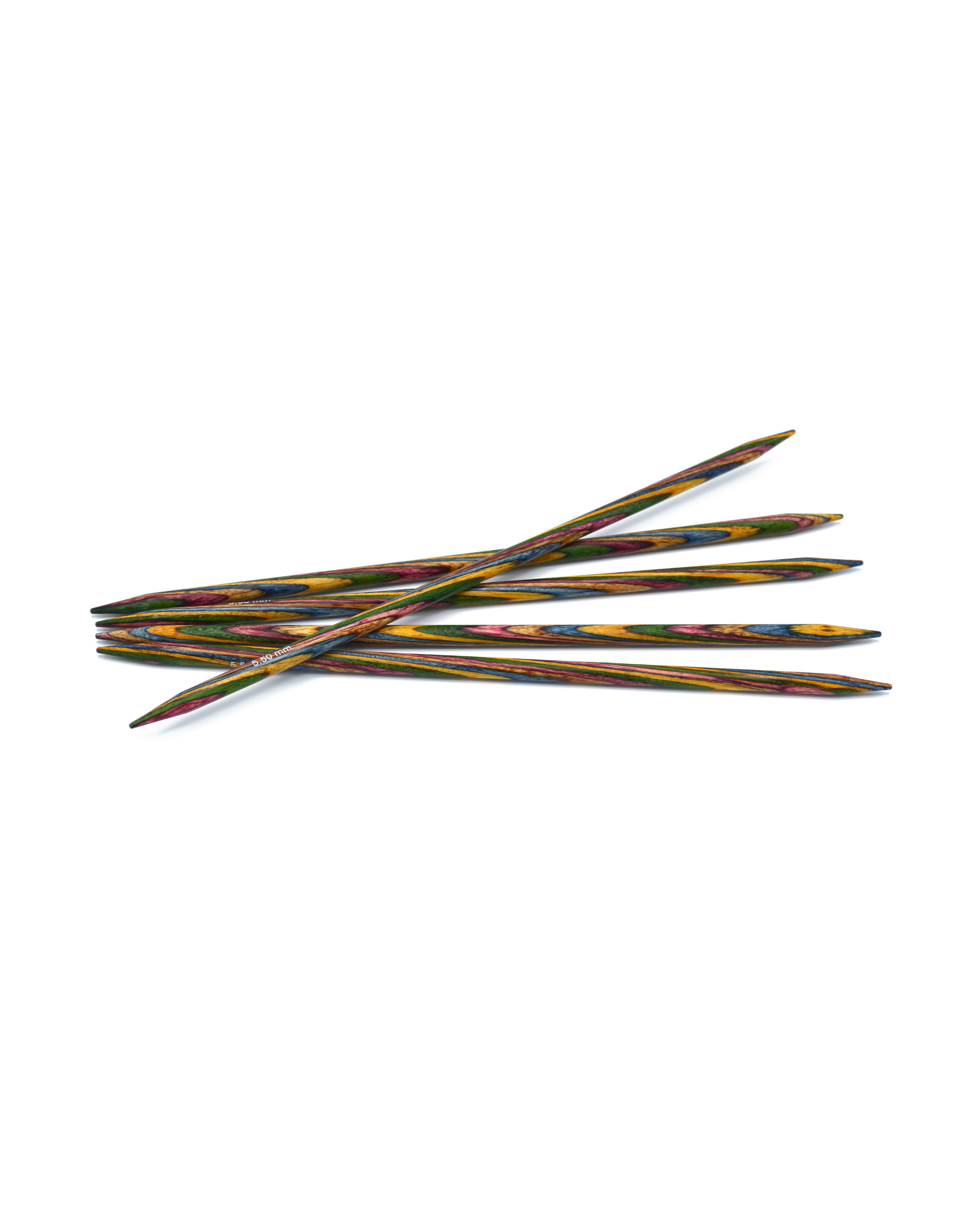 Symfonie regnbuefargede strømpepinner fra KnitPro er er en av våre bestselgende og mest populære serier. Strikkepinnene er laminert bjørk med en glatt lakkert overflate og perfekt spissede tupper som gjør at maskene glir lekende lett over pinnen.