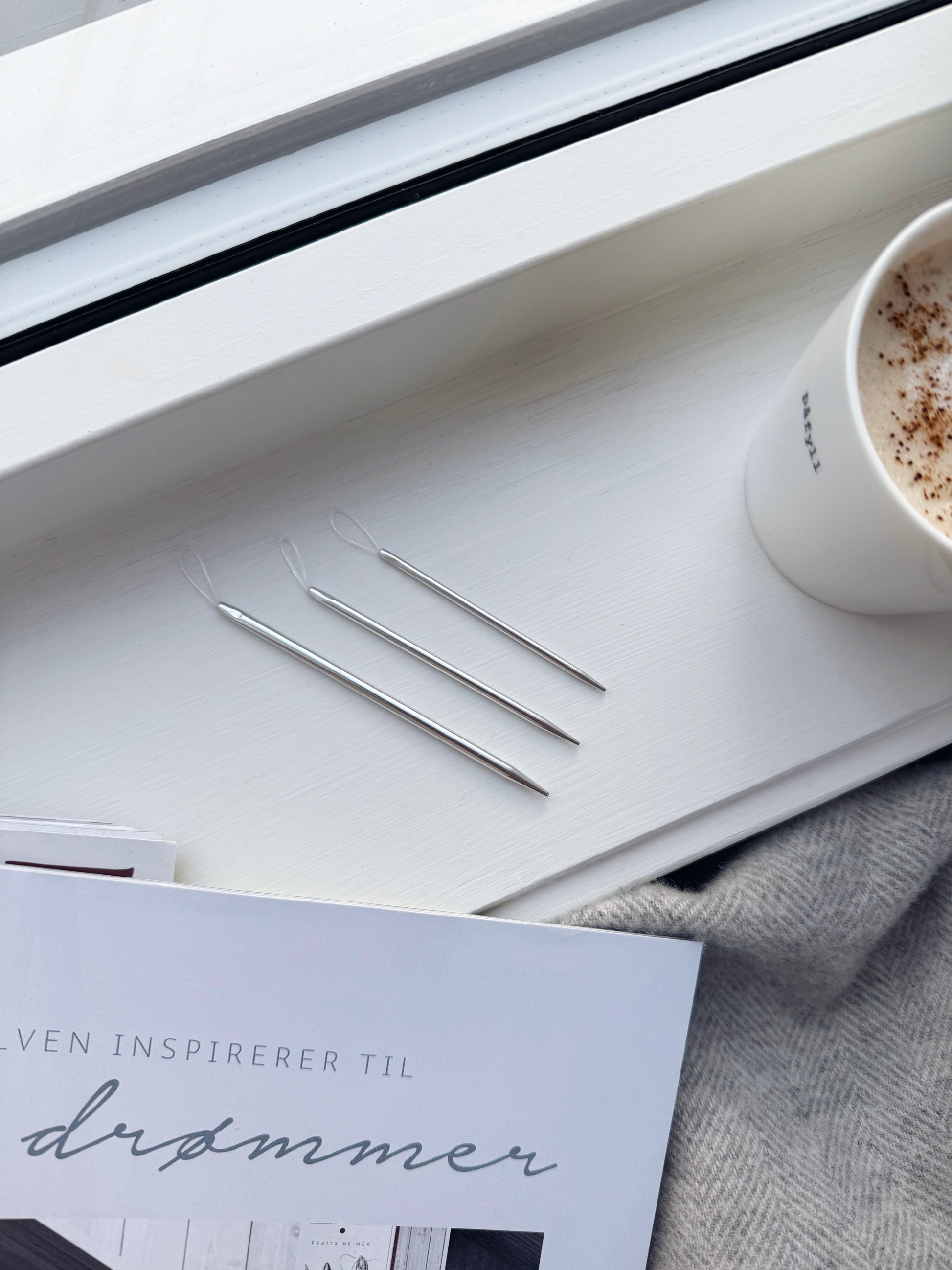Tre ullnåler i høykvalitets aluminium med fleksibelt nåløye i plastkabel. Perfekte til å feste tråder og til arbeid med alle typer garn.