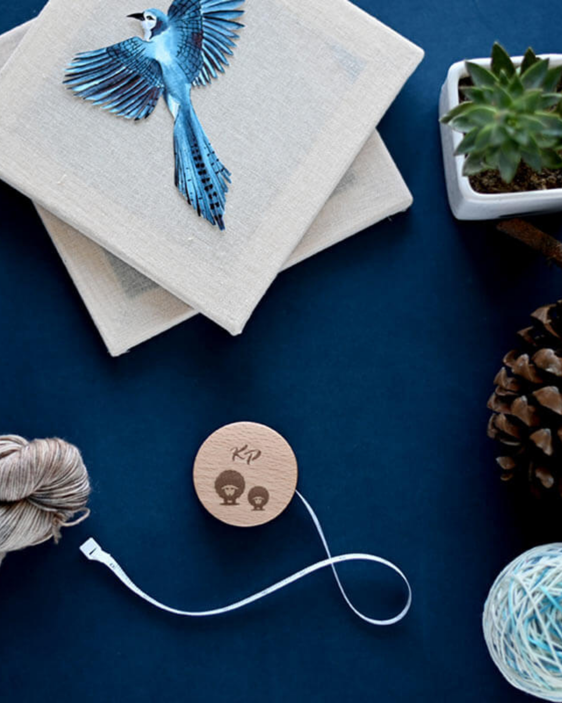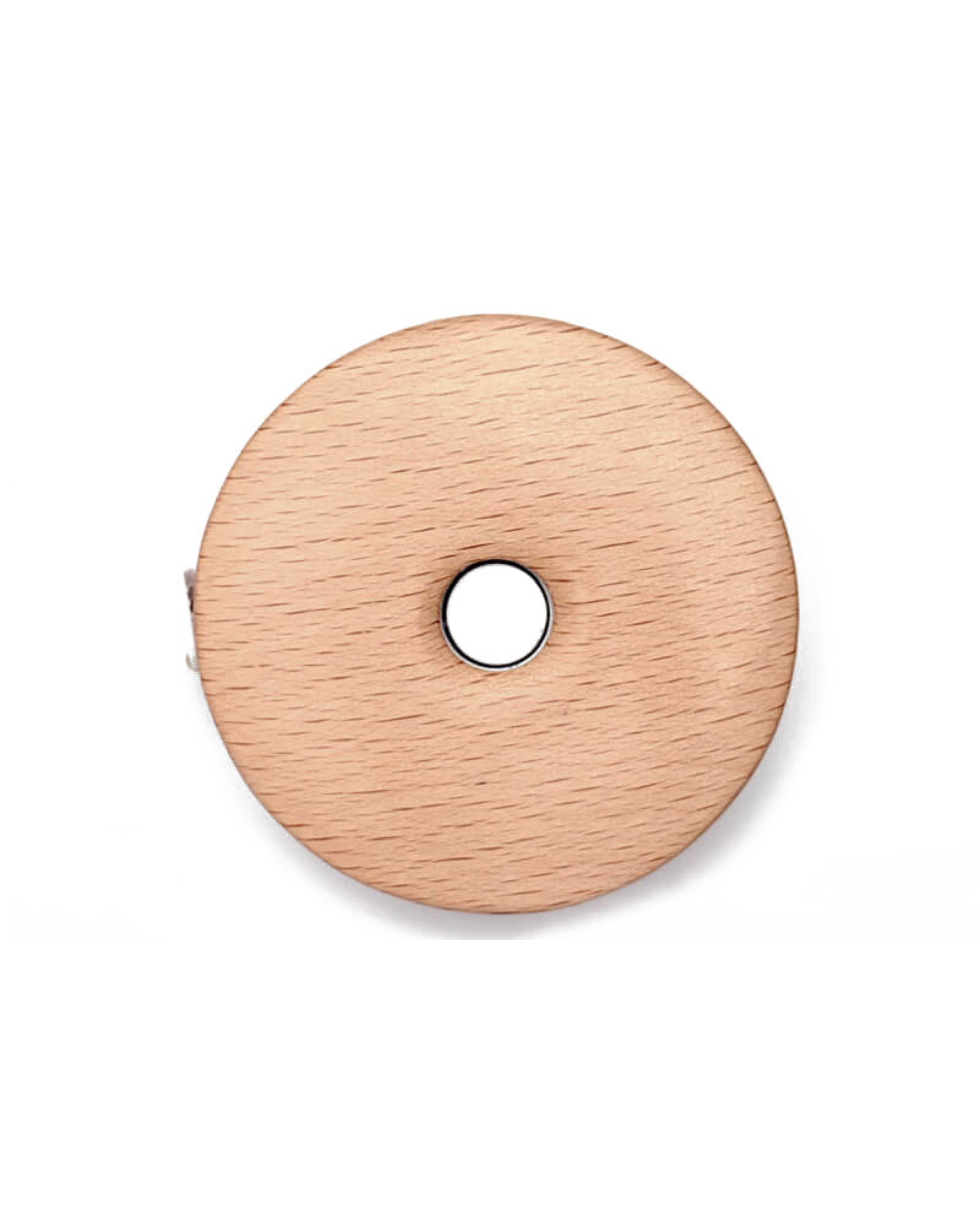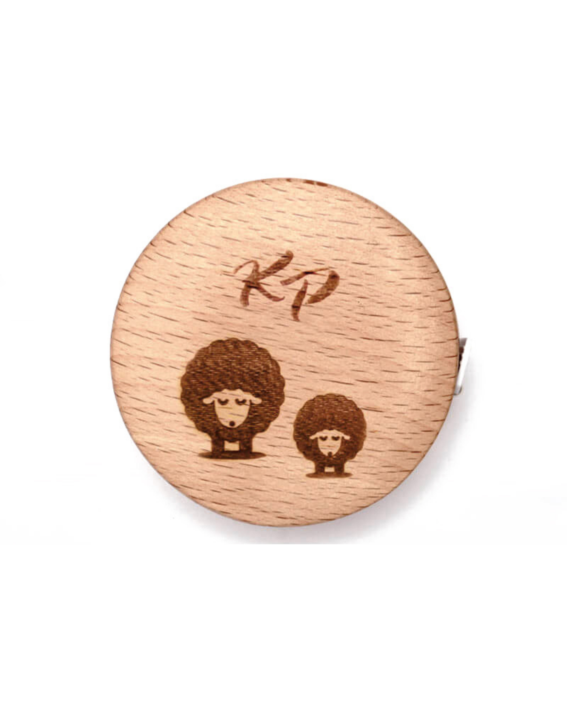 Rundt målebånd i bjørk og vinyl med søt sauedekor på fremsiden. Målebåndet trekkes jevnt ut og rulles inn igjen med et trykk på knappen i midten. Måler opptil 152 cm/US60.